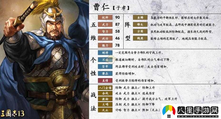 曹仁作為名高級武將,在合戰(zhàn)天下中擁有出色的基礎(chǔ)屬性。他的生命值和防御力較高,使得他在戰(zhàn)場上具備較強的生存能力。曹仁的攻擊力也不容小覷,能夠在戰(zhàn)斗中造成可觀的傷害。