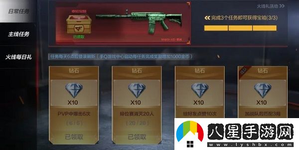 1、每日任務(wù)45,每日爆頭10,每日特殊任務(wù)7=每天保底62鉆石