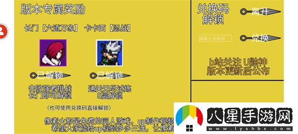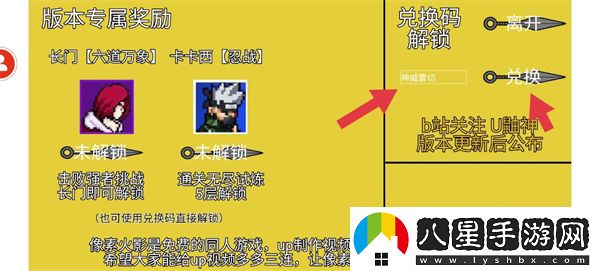 2、在這里就可以看到需要一定的條件才能夠解鎖卡卡西和長(zhǎng)門,但是我們可以通過兌換碼來進(jìn)行解鎖,輸入神威雷切解鎖卡卡西,輸入輪回六道解鎖長(zhǎng)門。