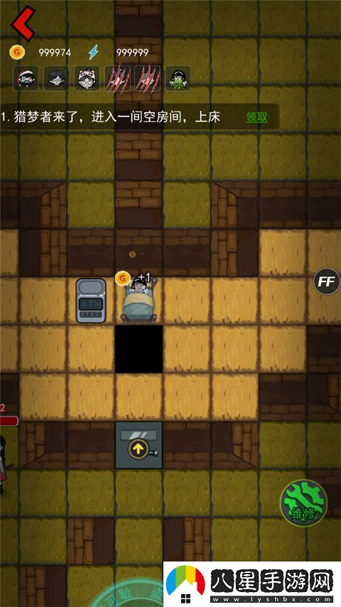 4、第二關(guān)由宿舍阿姨鎮(zhèn)守,如果房間道具沒有造滿,她是可以遁地進入房間。她還能回到地圖中間回血,可以趁這個時候,造炮塔攻擊。