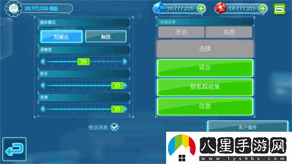 4、在選項(xiàng)設(shè)置里,我們可以更換語言、操作方式、音樂、音效、靈敏度等等
