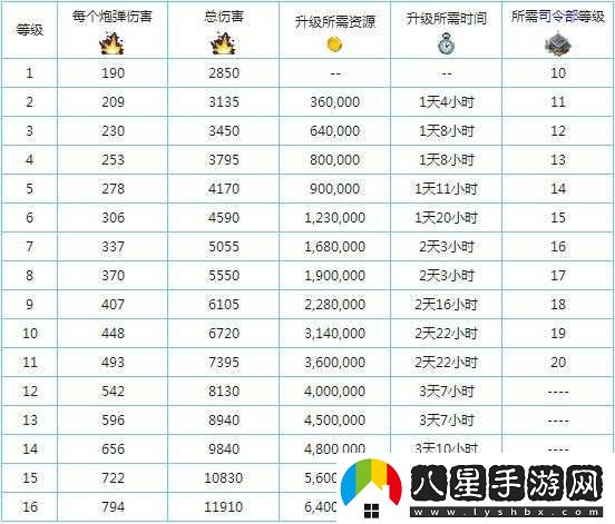 為了更直觀地展示巨型加農(nóng)炮升級(jí)的具體情況,以下是一個(gè)大致的升級(jí)數(shù)據(jù)表: