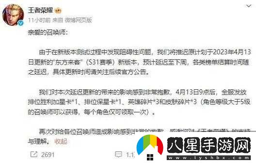好的,讓我們深入了解王者榮耀S31賽季延期補償?shù)南嚓P(guān)內(nèi)容。游戲過程中有時會因為某些原因需要調(diào)整賽程,而在面臨延期時,對玩家的補償往往是重要的舉措,不僅能維持玩家的積極性,也是對承諾的種履行。以下是關(guān)于S31賽季延期的補償詳解。